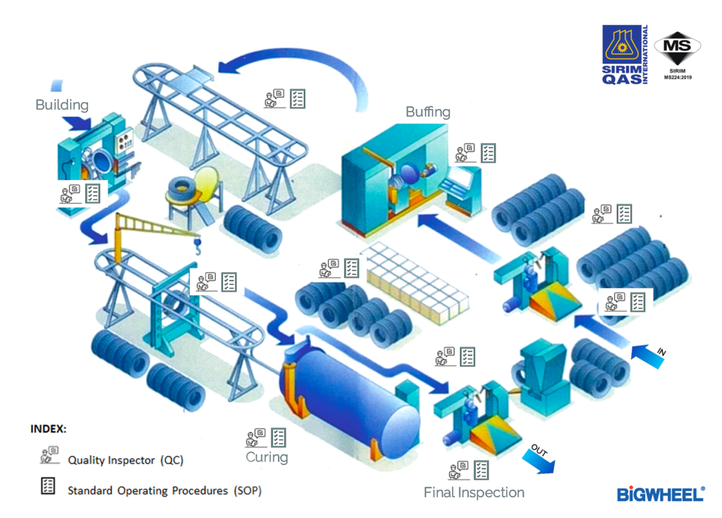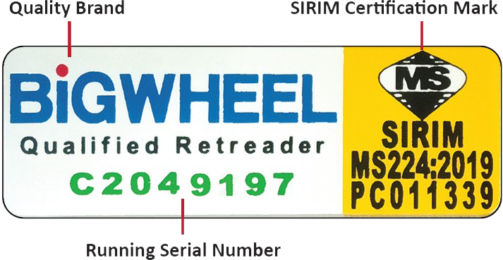 Kami merupakan Pengilang Tayar Masak yang Bertauliah, dan semua tayar yang dihasilkan di kilang kami mematuhi Malaysian Standards MS224:2019 and International Standards yang diakreditasi oleh SIRIM QAS International Sdn. Bhd.